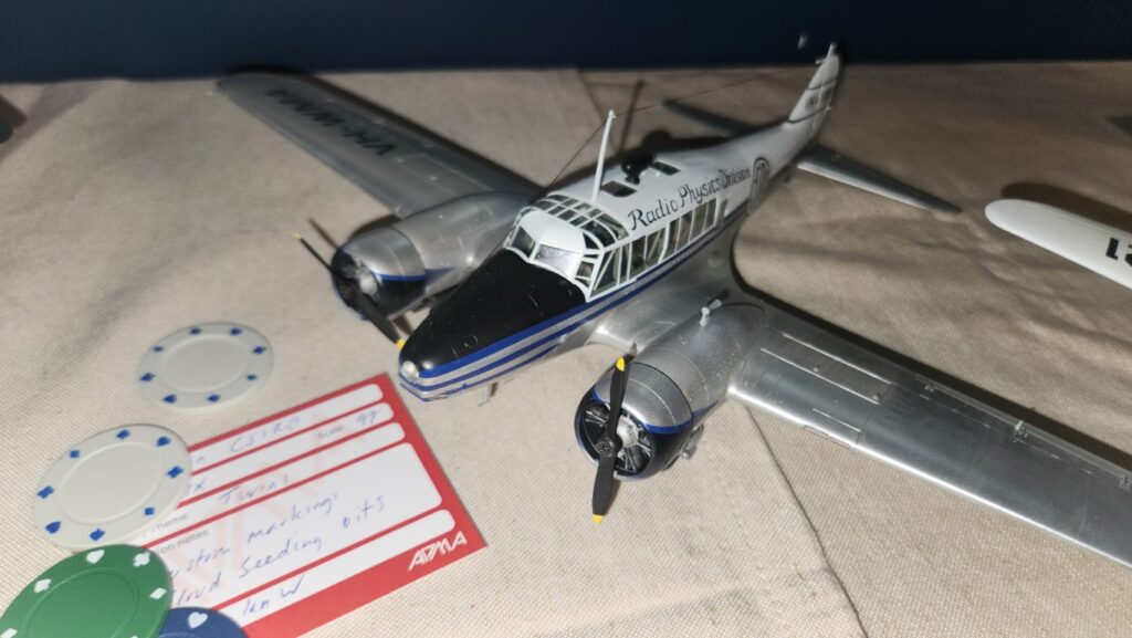 Ley Presented Platypus Publications Gift Certificates to first and second place holders as voted by members attending the meeting. Ian Wrenford took out first place with his Avro Anson CSIRO cloud seeding aircraft and Phil Wordsworth was runner up with his Northrop F89J Scorpion. See the theme winners cards below for more details about both of these models.